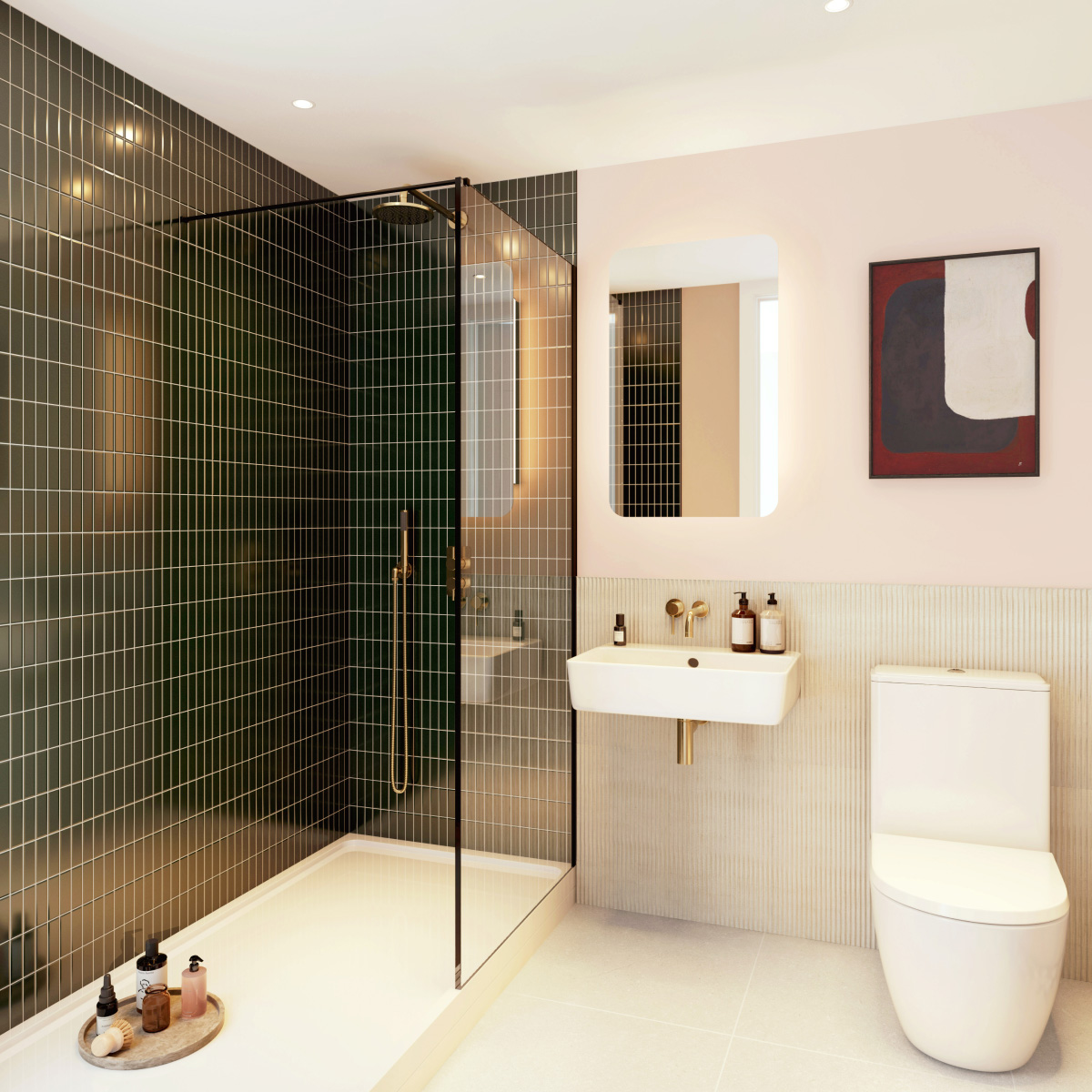 Deep green tiling in the walk-in showers is complemented by brushed gold brassware