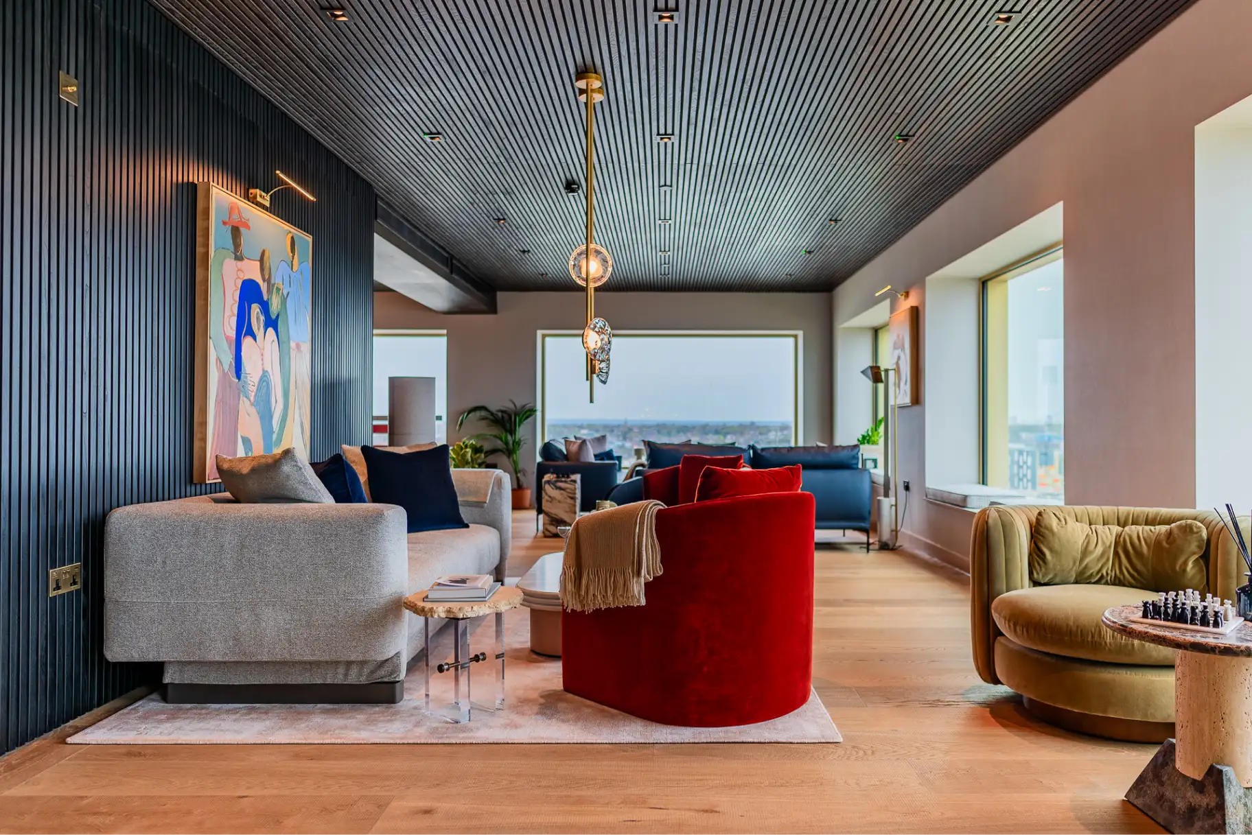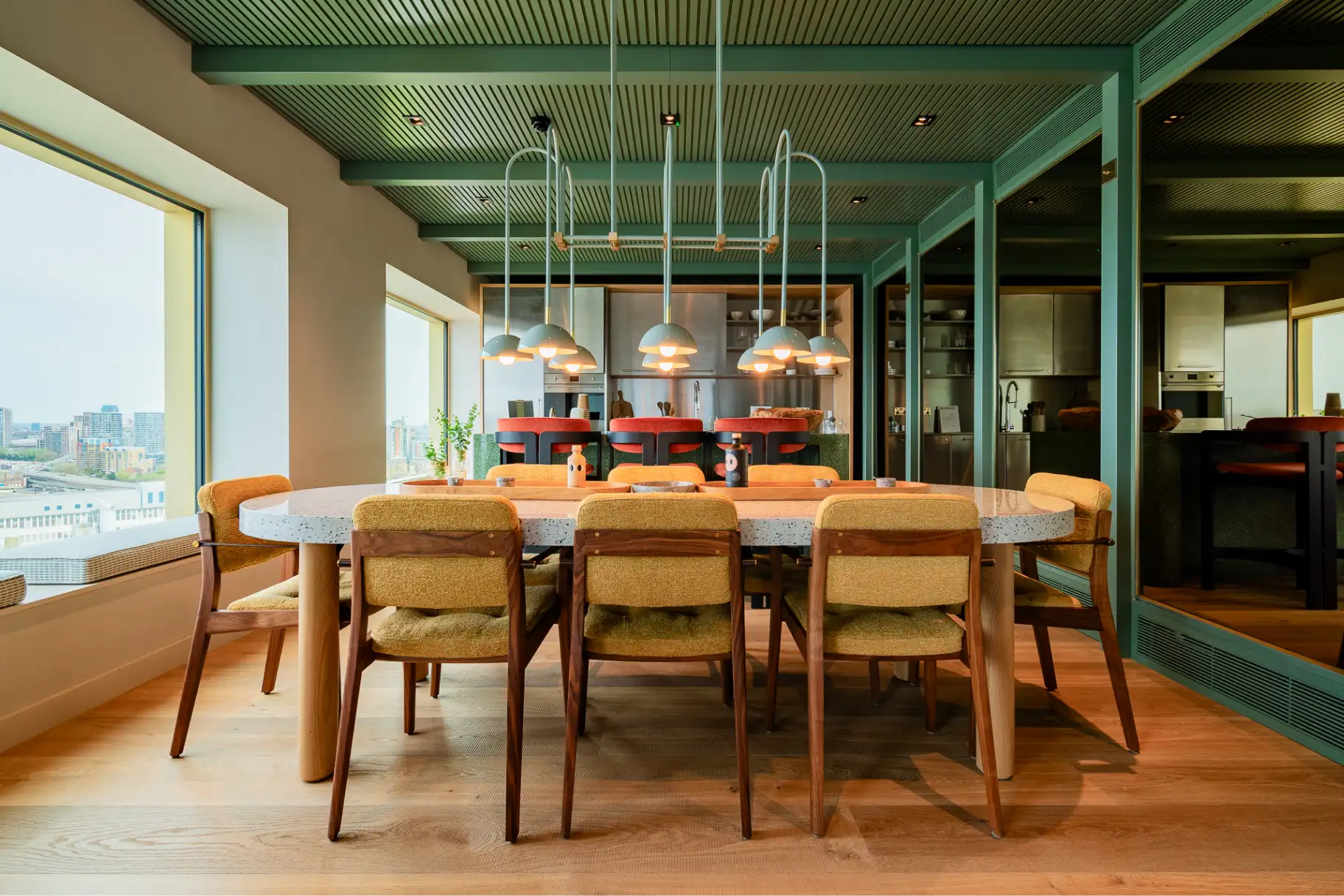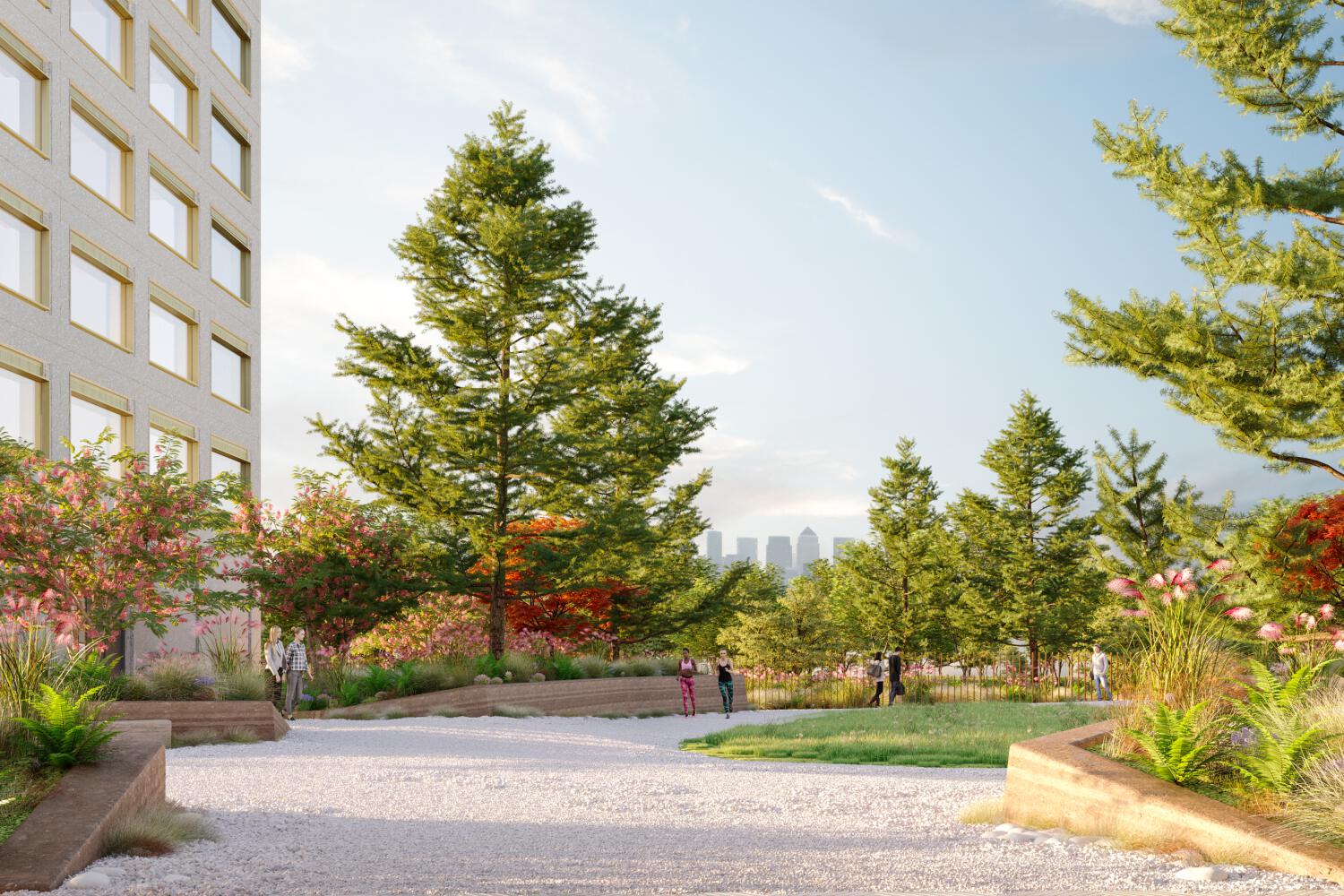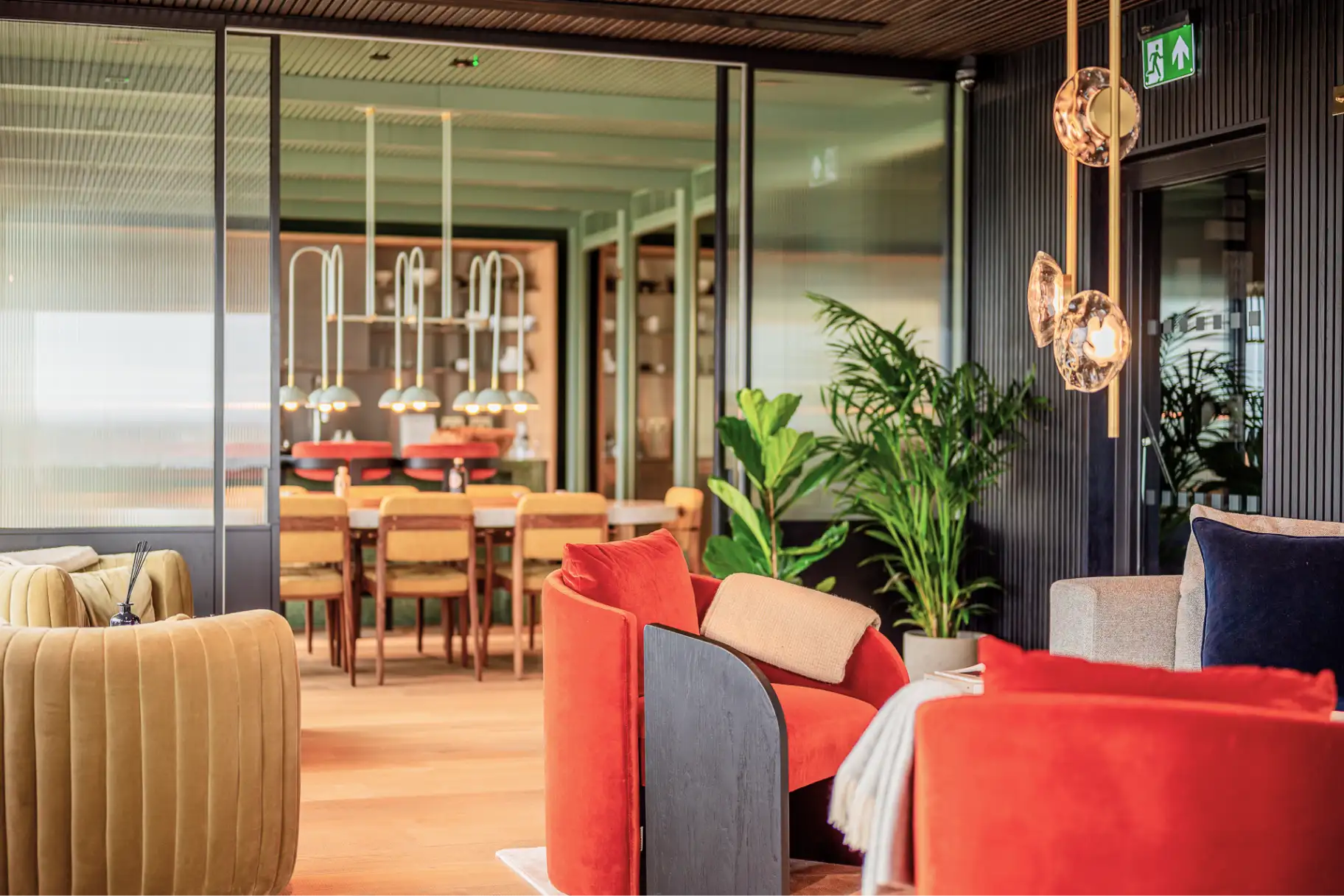 Entrance lobbies celebrate the connection between inside and out. Floor to ceiling windows and natural materials provide seemingly endless botanical vistas out towards the gardens.